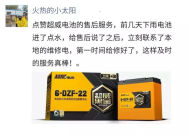 服务也是超威电池给予消费者最好的承诺。早在2011年超威就已提出“对每一只售出的超威电池服务到底”的售后服务理念,并出台新举措做到每一只电池出厂有跟踪、检测有标准、退货有依据的全新售后标准。截止目前超威电池已在全国设立了销售服务一体网点30多万家,售后服务面覆盖全国,实现了产品销售与售后服务的无缝对接。