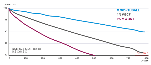 低于0.1%的TUBALL单壁碳纳米管添加量即可提供更高的能量密度,比作为导电添加剂的多壁碳纳米管或炭黑添加量低10-60倍。