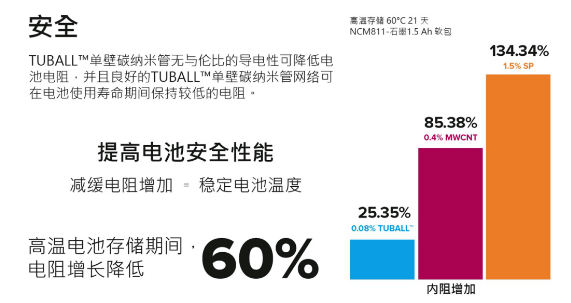 作为可用于锂电池配方中的导电材料,添加少量的TUBALL单壁碳纳米管可以降低电池内阻(DCR),从而降低电池的温度积累,降低电池起火的风险。