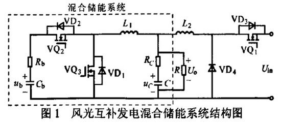 蓄电池与超级电容器并联连接。并联控制器主要任务是控制充放电电流、放电深度、循环工作次数等。因此。对其控制过程的设计是系统的关键,要综合考虑多方面因素的影响。如混合储能装置的容量配置、气候条件、负荷状况等,重点考虑因日照强度和风力大小等环境因素的变化所导致的发电功率的波动。以及负载功率脉动对蓄电池的影响。