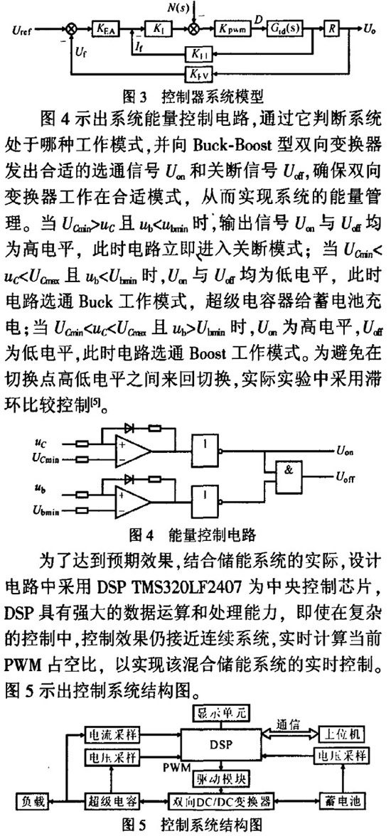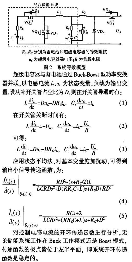超级电容器与蓄电池通过Buck—Boost型双向功率变换器并联,输入电压玩通过Buck电路给储能系统供电。图2示出系统等效模型。