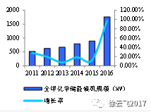 电化学电池技术是当前储能行业一大增长点。截至2016年底,全球电化学储能装机规模达1756.5MW,近5年复合增长率27.5%。我国储能产业起步相对较晚,经过十多年发展,目前正从小规模研究示范向商业化初期过渡发展。