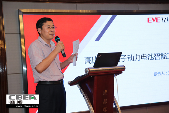 图为惠州亿纬锂能股份有限公司智慧工厂部经理许少锋发表主题演讲