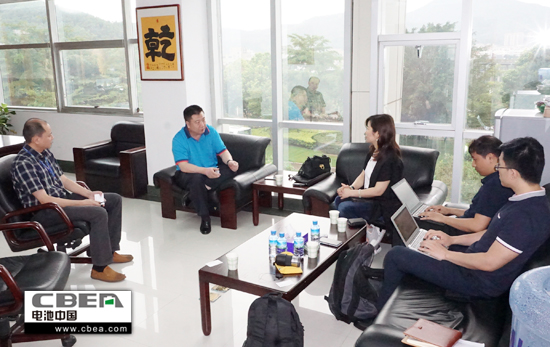 图为电池中国网总编辑张雨与比克电池关负责人交流