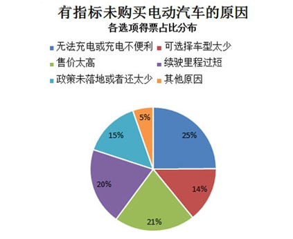在调查中,36.85%的人选择了售价太高这一选项,在整体原因分布中占21%。新能源车型相比同款传统汽油车售价高出一大节。北京E150 共有时尚版和科技版两款车型,其官方售价分别为22.08万和23.08万。根据国家补贴政策和相关标准,该车可享受国家补贴(4.75万)+地方补贴(4.75万)共9.5万元,消费者购买E150 的终端价格为12.58万和13.58万。但传统动力2013款两厢 1.5T 手动乐天版指导价6.18万。价格高进一步制约了电动汽车的发展。北汽新能源汽车公司最近开展“蓝天行动”,每辆E150EV电动车优惠5.1万元。
